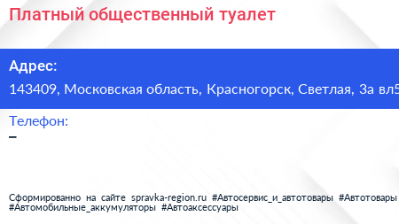 Платный общественный туалет по адресу 143409, Московская область, Красногорск, Светлая, 3а вл5 в дальнейшем Организация, размещена в следующих категориях: