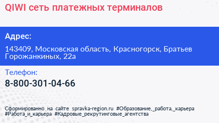 QIWI, сеть платежных терминалов по адресу 143409, Московская область, Красногорск, Братьев Горожанкиных, 22а в дальнейшем Организация, размещена в следующих категориях: