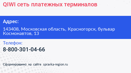 QIWI, сеть платежных терминалов по адресу 143408, Московская область, Красногорск, бульвар Космонавтов, 13 в дальнейшем Организация, размещена в следующих категориях: