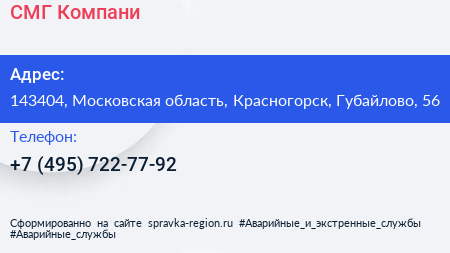 СМГ Компани по адресу 143404, Московская область, Красногорск, Губайлово, 56 в дальнейшем Организация, размещена в следующих категориях: