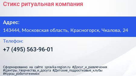 Стикс, ритуальная компания по адресу 143444, Московская область, Красногорск, Чкалова, 24 в дальнейшем Организация, размещена в следующих категориях:
