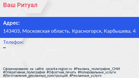 Ваш Ритуал по адресу 143403, Московская область, Красногорск, Карбышева, 4 в дальнейшем Организация, размещена в следующих категориях: