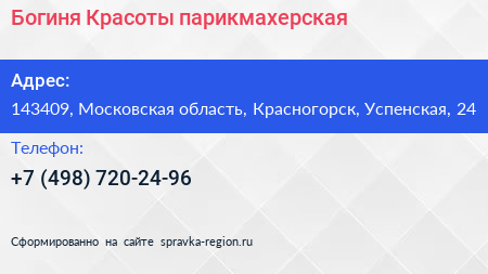 Богиня Красоты, парикмахерская по адресу 143409, Московская область, Красногорск, Успенская, 24 в дальнейшем Организация, размещена в следующих категориях: