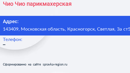 Чио Чио, парикмахерская по адресу 143409, Московская область, Красногорск, Светлая, 3а ст5 в дальнейшем Организация, размещена в следующих категориях: