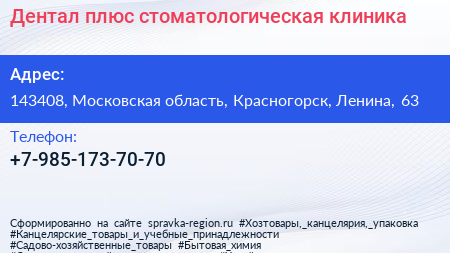 Дентал плюс, стоматологическая клиника по адресу 143408, Московская область, Красногорск, Ленина, 63 в дальнейшем Организация, размещена в следующих категориях: