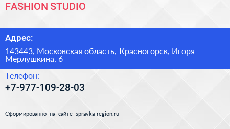 FASHION STUDIO по адресу 143443, Московская область, Красногорск, Игоря Мерлушкина, 6 в дальнейшем Организация, размещена в следующих категориях:
