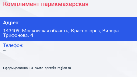 Комплимент, парикмахерская по адресу 143409, Московская область, Красногорск, Вилора Трифонова, 4 в дальнейшем Организация, размещена в следующих категориях: