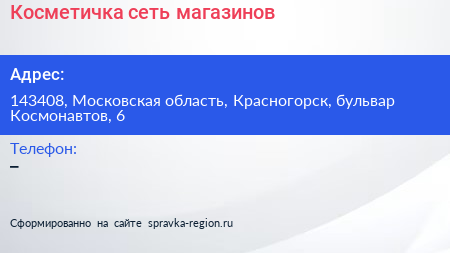 Косметичка, сеть магазинов по адресу 143408, Московская область, Красногорск, бульвар Космонавтов, 6 в дальнейшем Организация, размещена в следующих категориях: