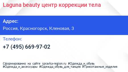 Laguna beauty, центр коррекции тела по адресу Laguna Beauty, 3, Кленовая улица, Микрогород «В лесу», Отрадное, городской округ Красногорск, Московская область, Центральный федеральный округ, 143442, Россия в дальнейшем Организация, размещена в следующих категориях:
