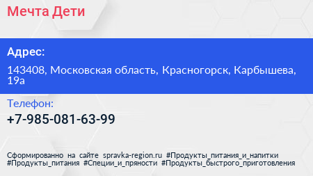 Мечта Дети по адресу 143408, Московская область, Красногорск, Карбышева, 19а в дальнейшем Организация, размещена в следующих категориях: