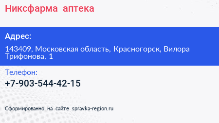 Никсфарма+, аптека по адресу 143409, Московская область, Красногорск, Вилора Трифонова, 1 в дальнейшем Организация, размещена в следующих категориях: