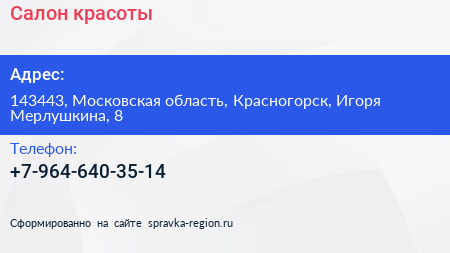 Салон красоты по адресу 143443, Московская область, Красногорск, Игоря Мерлушкина, 8 в дальнейшем Организация, размещена в следующих категориях: