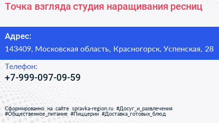 Точка взгляда, студия наращивания ресниц по адресу 143409, Московская область, Красногорск, Успенская, 28 в дальнейшем Организация, размещена в следующих категориях: