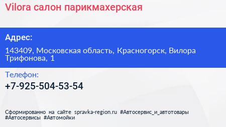 Vilora, салон-парикмахерская по адресу 143409, Московская область, Красногорск, Вилора Трифонова, 1 в дальнейшем Организация, размещена в следующих категориях: