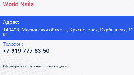 World Nails по адресу 143408, Московская область, Красногорск, Карбышева, 10 к1 в дальнейшем Организация, размещена в следующих категориях: