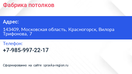Фабрика потолков по адресу 143409, Московская область, Красногорск, Вилора Трифонова, 7 в дальнейшем Организация, размещена в следующих категориях: