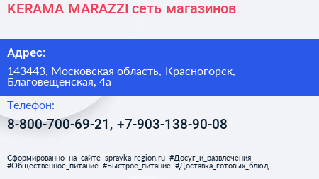 KERAMA MARAZZI, сеть магазинов по адресу 143443, Московская область, Красногорск, Благовещенская, 4а в дальнейшем Организация, размещена в следующих категориях: