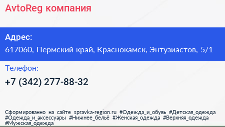 AvtoReg, компания по адресу 617060, Пермский край, Краснокамск, Энтузиастов, 5/1 в дальнейшем Организация, размещена в следующих категориях: