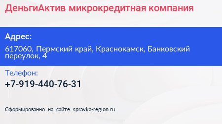 ДеньгиАктив, микрокредитная компания по адресу 617060, Пермский край, Краснокамск, Банковский переулок, 4 в дальнейшем Организация, размещена в следующих категориях: