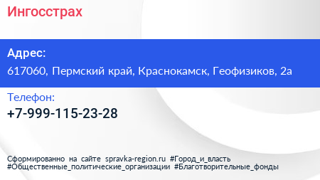 Ингосстрах по адресу 617060, Пермский край, Краснокамск, Геофизиков, 2а в дальнейшем Организация, размещена в следующих категориях: