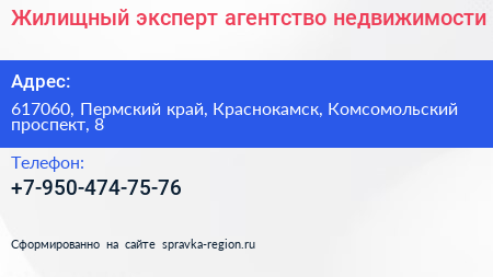 Жилищный эксперт, агентство недвижимости по адресу 617060, Пермский край, Краснокамск, Комсомольский проспект, 8 в дальнейшем Организация, размещена в следующих категориях: