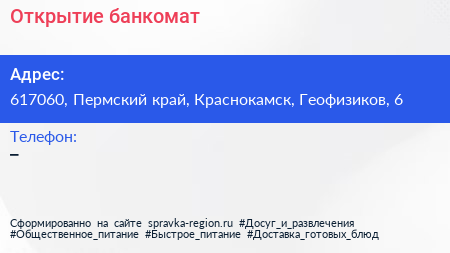 Открытие, банкомат по адресу 617060, Пермский край, Краснокамск, Геофизиков, 6 в дальнейшем Организация, размещена в следующих категориях: