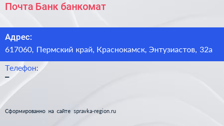 Почта Банк, банкомат по адресу 617060, Пермский край, Краснокамск, Энтузиастов, 32а в дальнейшем Организация, размещена в следующих категориях: