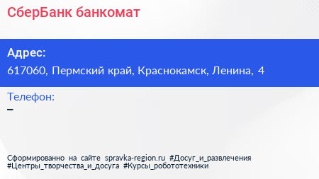 СберБанк, банкомат по адресу 617060, Пермский край, Краснокамск, Ленина, 4 в дальнейшем Организация, размещена в следующих категориях: