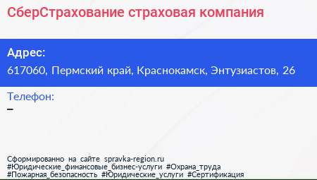 СберСтрахование, страховая компания по адресу 617060, Пермский край, Краснокамск, Энтузиастов, 26 в дальнейшем Организация, размещена в следующих категориях: