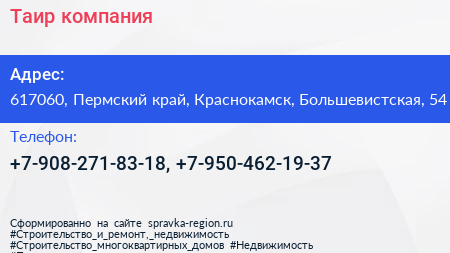 Таир, компания по адресу 617060, Пермский край, Краснокамск, Большевистская, 54 в дальнейшем Организация, размещена в следующих категориях: