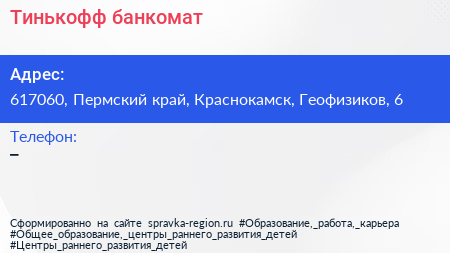 Тинькофф, банкомат по адресу 617060, Пермский край, Краснокамск, Геофизиков, 6 в дальнейшем Организация, размещена в следующих категориях: