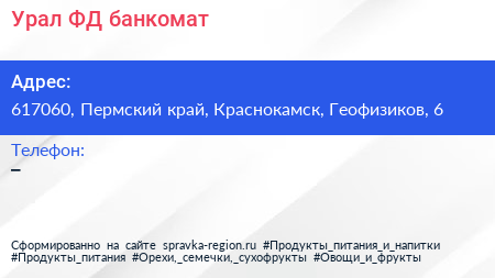 Урал ФД, банкомат по адресу 617060, Пермский край, Краснокамск, Геофизиков, 6 в дальнейшем Организация, размещена в следующих категориях: