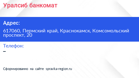 Уралсиб, банкомат по адресу 617060, Пермский край, Краснокамск, Комсомольский проспект, 20 в дальнейшем Организация, размещена в следующих категориях: