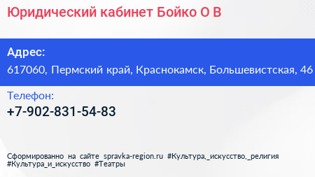 Юридический кабинет Бойко О.В. по адресу 617060, Пермский край, Краснокамск, Большевистская, 46 в дальнейшем Организация, размещена в следующих категориях: