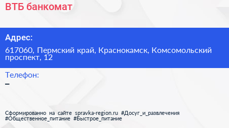 ВТБ, банкомат по адресу 617060, Пермский край, Краснокамск, Комсомольский проспект, 12 в дальнейшем Организация, размещена в следующих категориях: