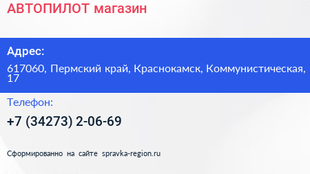 АВТОПИЛОТ, магазин по адресу 617060, Пермский край, Краснокамск, Коммунистическая, 17 в дальнейшем Организация, размещена в следующих категориях: