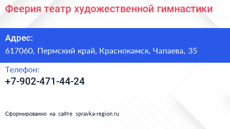Феерия, театр художественной гимнастики по адресу 617060, Пермский край, Краснокамск, Чапаева, 35 в дальнейшем Организация, размещена в следующих категориях: