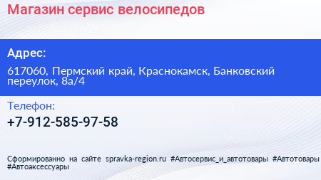 Магазин-сервис велосипедов по адресу 617060, Пермский край, Краснокамск, Банковский переулок, 8а/4 в дальнейшем Организация, размещена в следующих категориях: