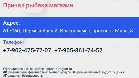 Причал рыбака, магазин по адресу 617060, Пермский край, Краснокамск, проспект Мира, 8 в дальнейшем Организация, размещена в следующих категориях: