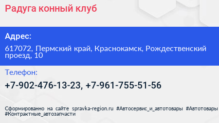 Радуга, конный клуб по адресу 617072, Пермский край, Краснокамск, Рождественский проезд, 10 в дальнейшем Организация, размещена в следующих категориях: