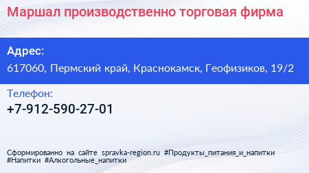 Маршал, производственно-торговая фирма по адресу 617060, Пермский край, Краснокамск, Геофизиков, 19/2 в дальнейшем Организация, размещена в следующих категориях: