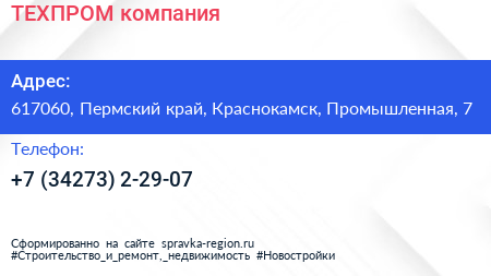 ТЕХПРОМ, компания по адресу 617060, Пермский край, Краснокамск, Промышленная, 7 в дальнейшем Организация, размещена в следующих категориях: