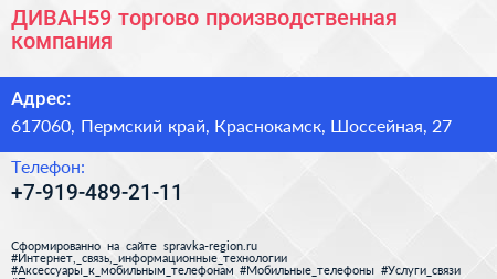 ДИВАН59, торгово-производственная компания по адресу 617060, Пермский край, Краснокамск, Шоссейная, 27 в дальнейшем Организация, размещена в следующих категориях: