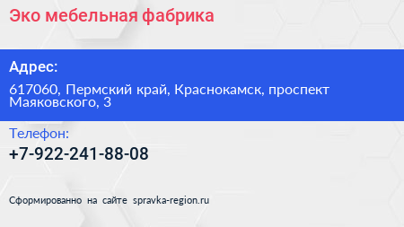 Эко, мебельная фабрика по адресу 617060, Пермский край, Краснокамск, проспект Маяковского, 3 в дальнейшем Организация, размещена в следующих категориях:
