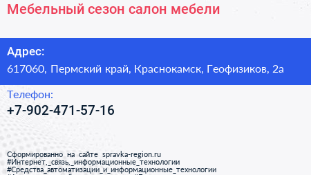 Мебельный сезон, салон мебели по адресу 617060, Пермский край, Краснокамск, Геофизиков, 2а в дальнейшем Организация, размещена в следующих категориях: