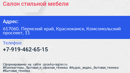 Салон стильной мебели по адресу 617060, Пермский край, Краснокамск, Комсомольский проспект, 11 в дальнейшем Организация, размещена в следующих категориях: