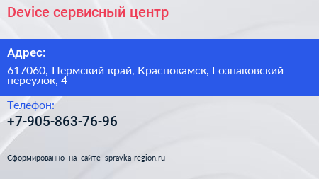 Device, сервисный центр по адресу 617060, Пермский край, Краснокамск, Гознаковский переулок, 4 в дальнейшем Организация, размещена в следующих категориях: