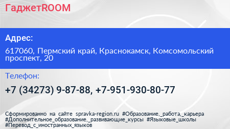 ГаджетROOM по адресу 617060, Пермский край, Краснокамск, Комсомольский проспект, 20 в дальнейшем Организация, размещена в следующих категориях: