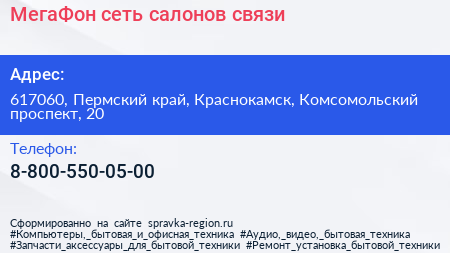 МегаФон, сеть салонов связи по адресу 617060, Пермский край, Краснокамск, Комсомольский проспект, 20 в дальнейшем Организация, размещена в следующих категориях: