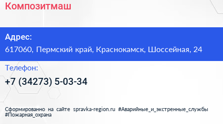 Композитмаш по адресу 617060, Пермский край, Краснокамск, Шоссейная, 24 в дальнейшем Организация, размещена в следующих категориях: